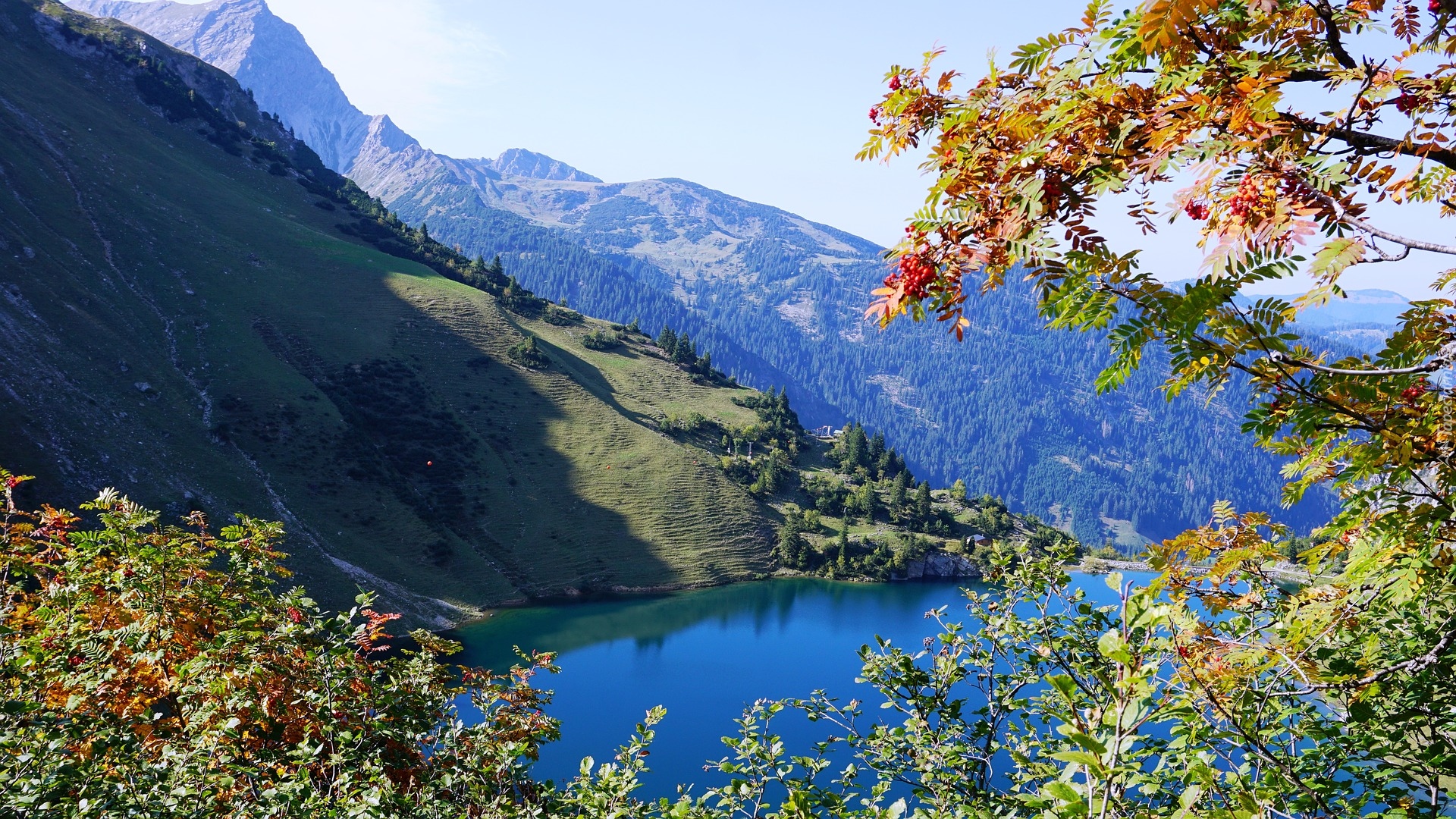 Edytor tapety: Widok zza gałęzi na górskie jezioro