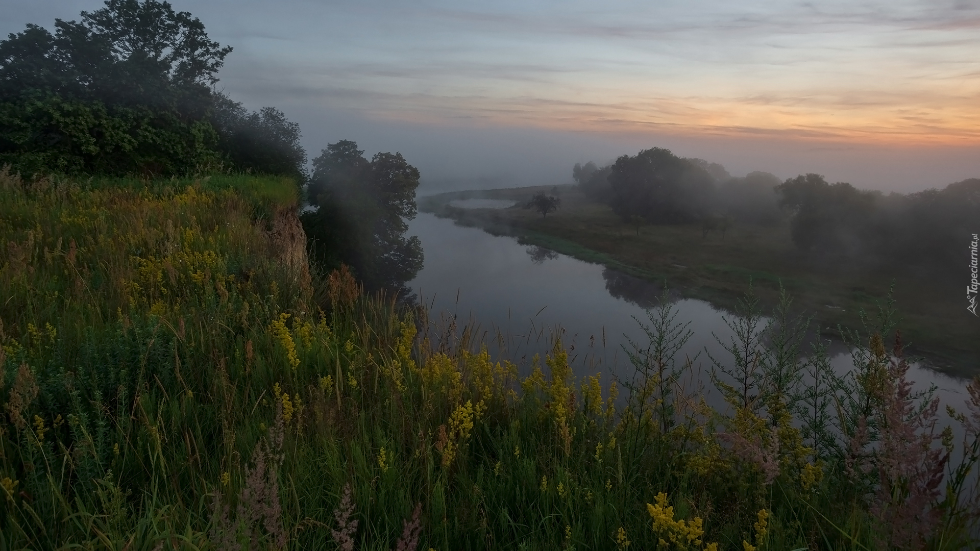 Edytor tapety: Łąka na skarpie nad zamgloną rzeką