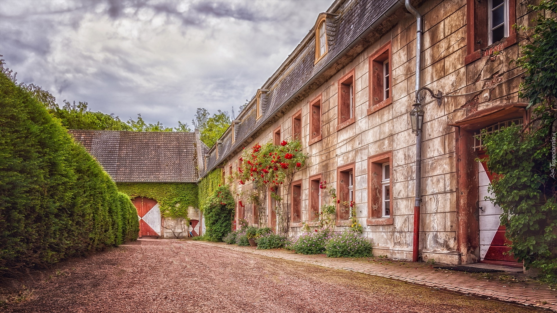 Edytor tapety: Droga pomiędzy domem a żywopłotem