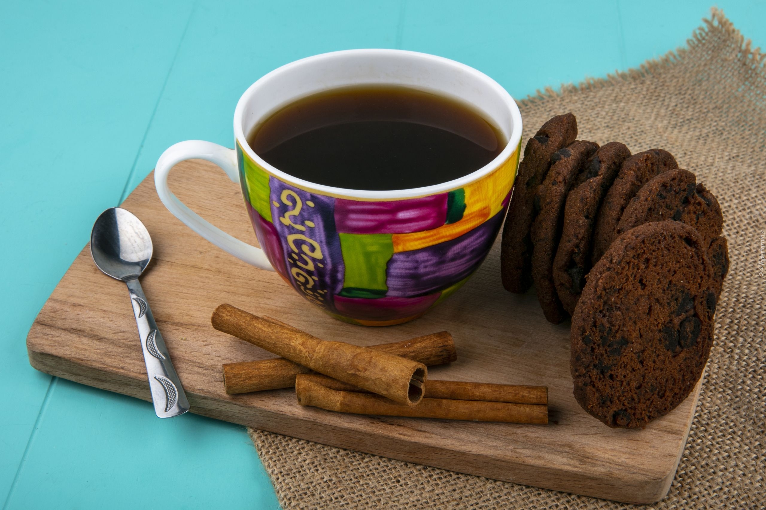 Edytor tapety: Cynamon i ciasteczka obok kawy w kolorowej filiżance
