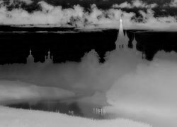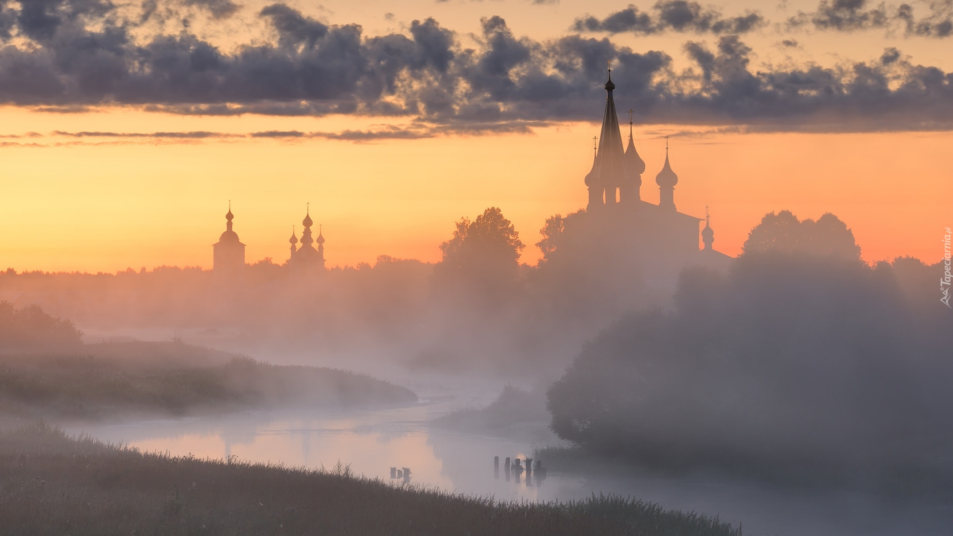 Edytor tapety: Cerkwie nad zamgloną rzeką Tezą w Dunilovie
