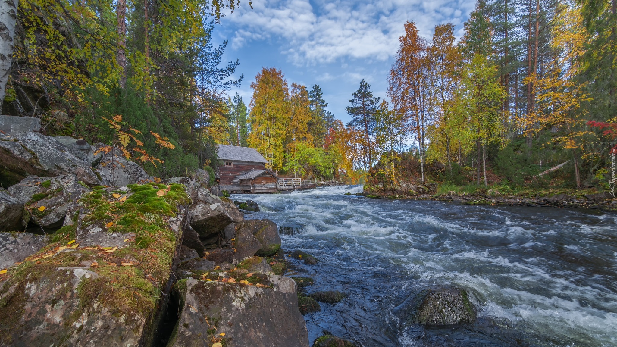 Edytor tapety: Rzeka i drewniany młyn w Parku Narodowym Oulanka