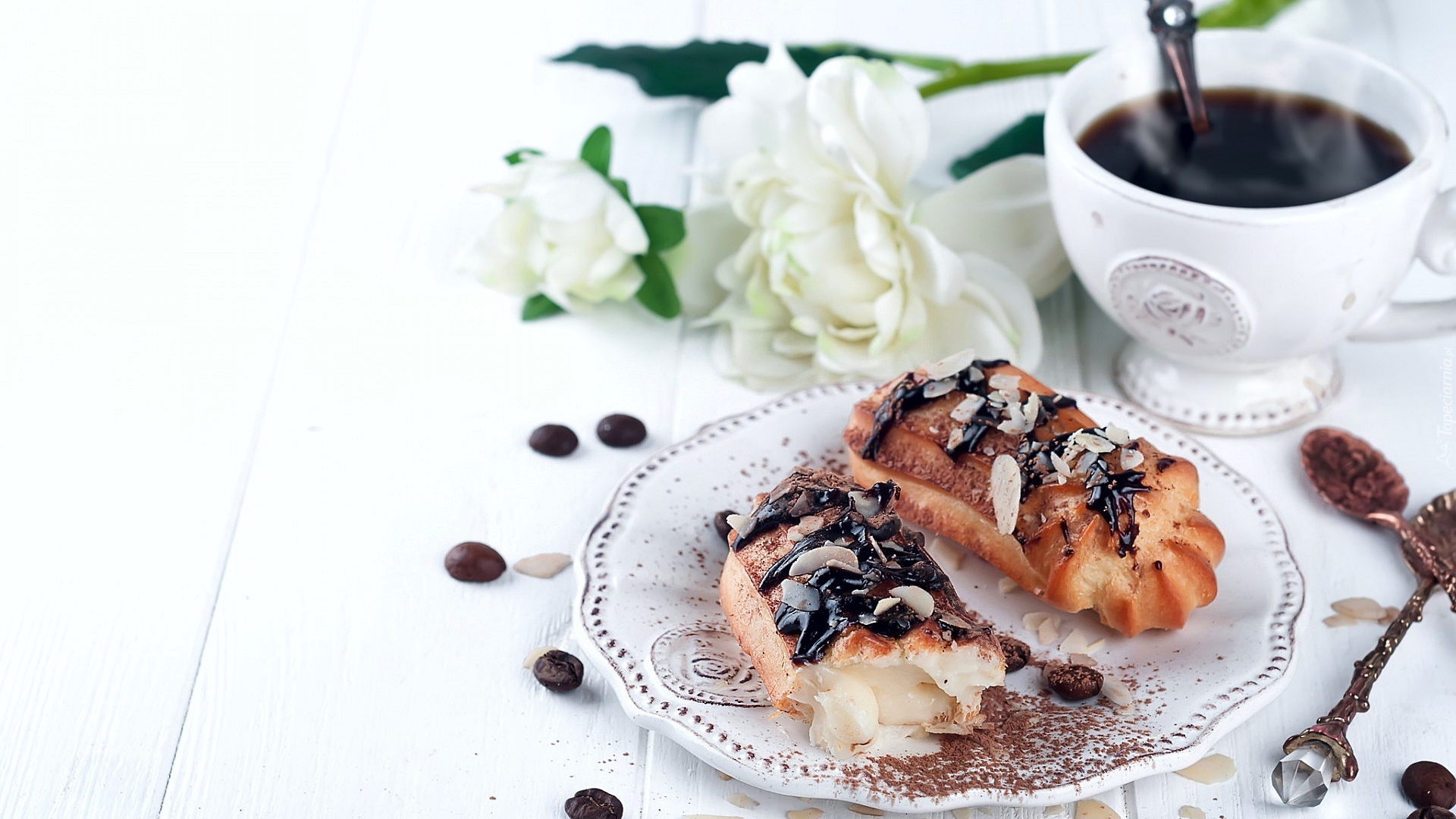 Edytor tapety: Dwa eklerki obok filiżanki kawy