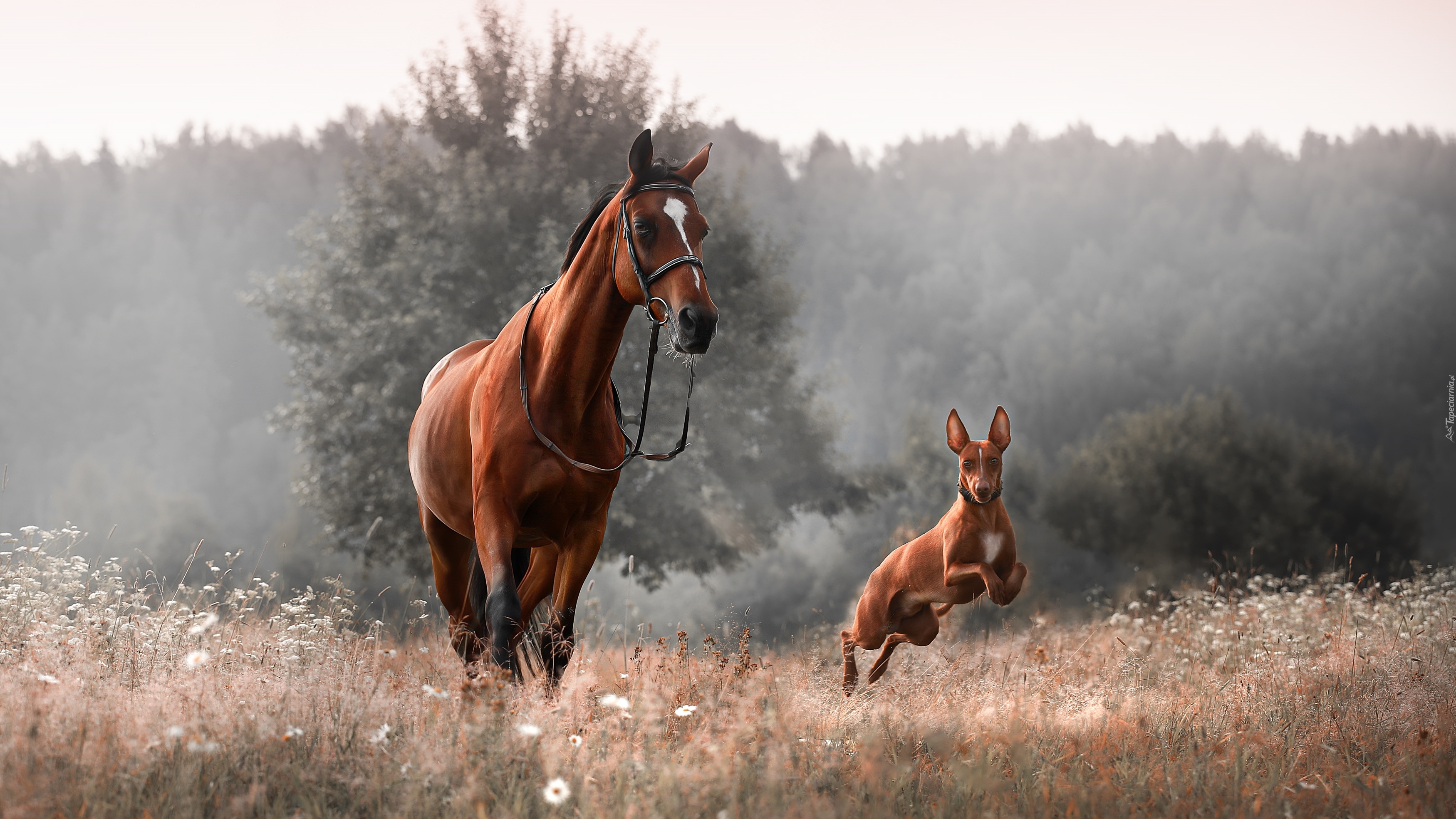 Edytor tapety: Koń i pies rasy podenco na zamglonej łące