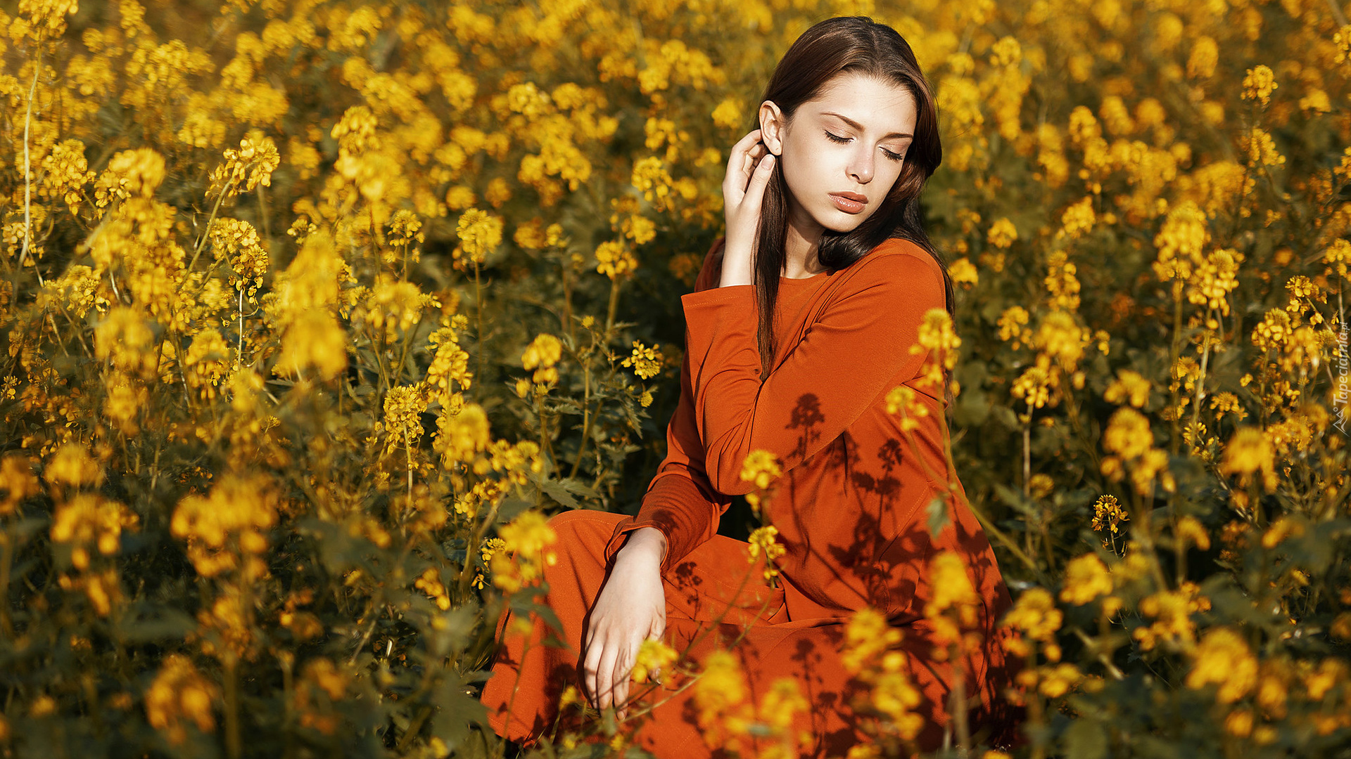 Edytor tapety: Kobieta w pomarańczowej sukni wśród kwiatów na łące