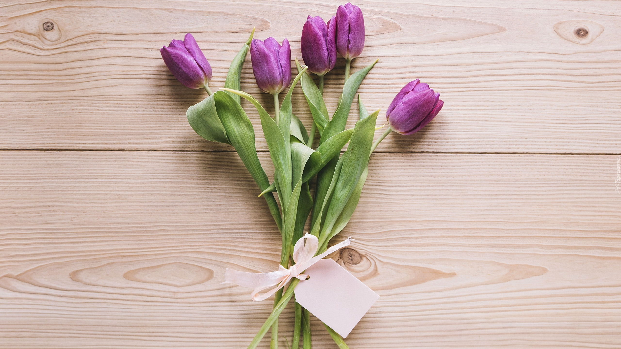 Edytor tapety: Fioletowe tulipany z kartonikiem na deskach
