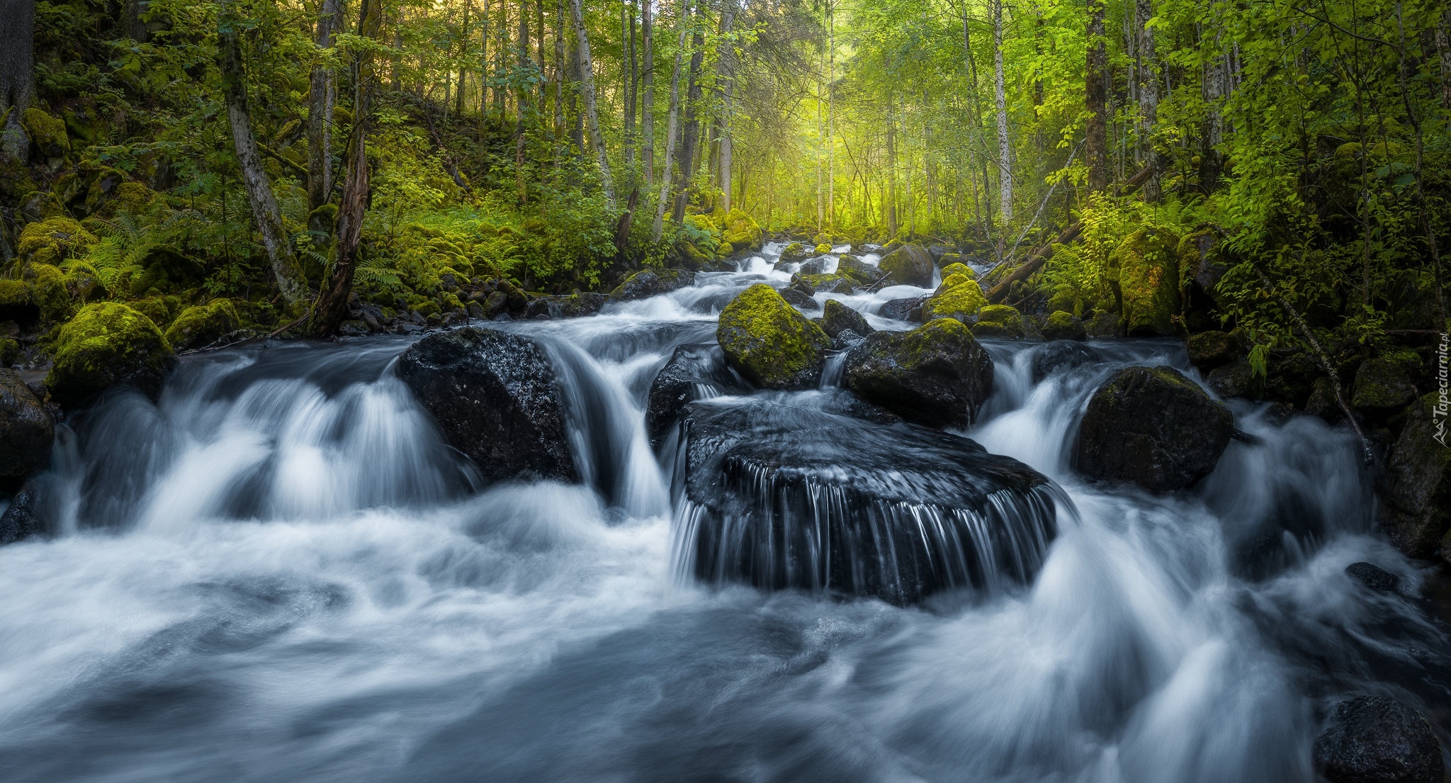 Edytor tapety: Kamienie na rwącej rzece w lesie