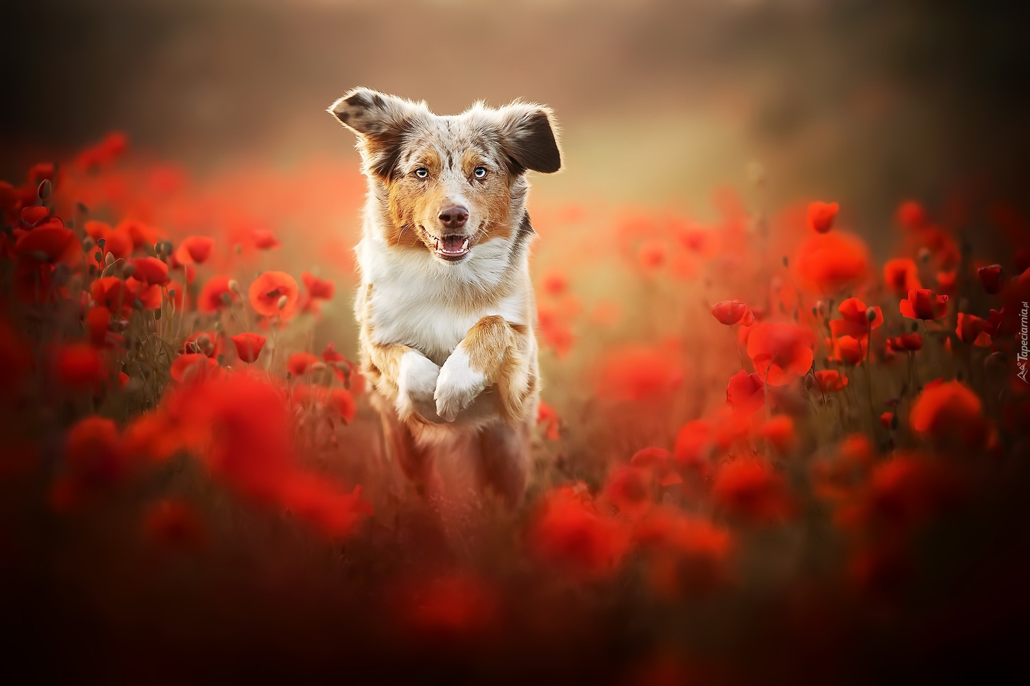 Edytor tapety: Owczarek australijski stojący w makach