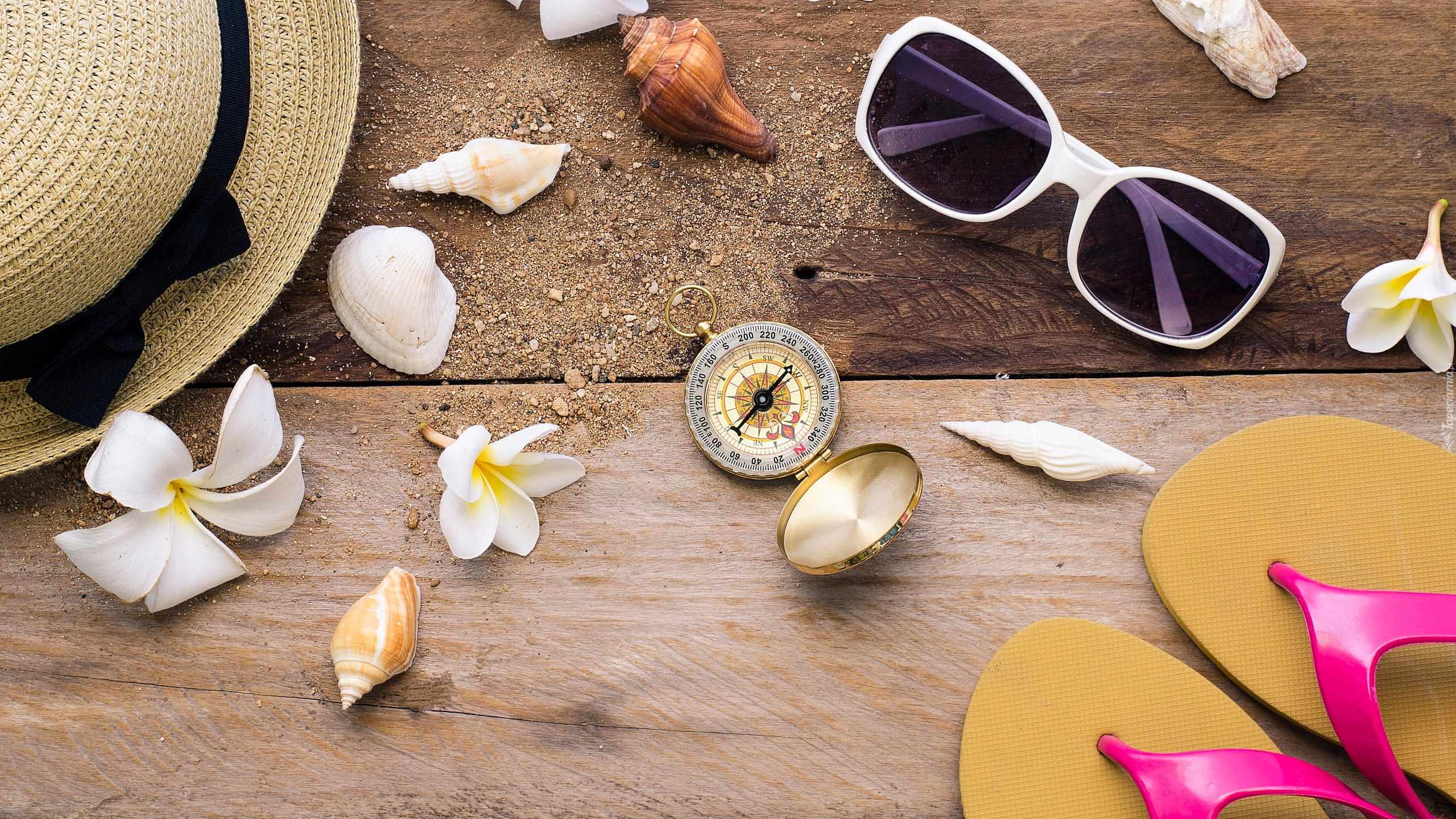 Edytor tapety: Wakacyjne akcesoria obok muszelek i kwiatów