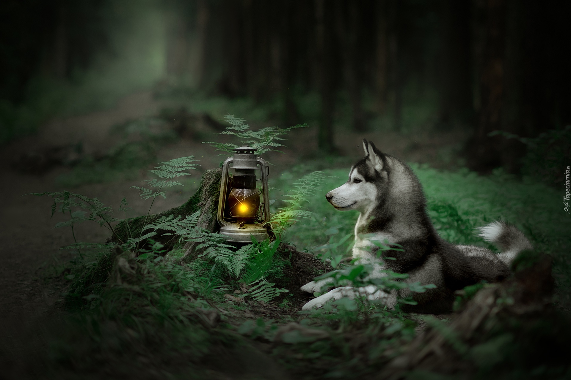 Edytor tapety: Siberian husky obok lampy naftowej w lesie