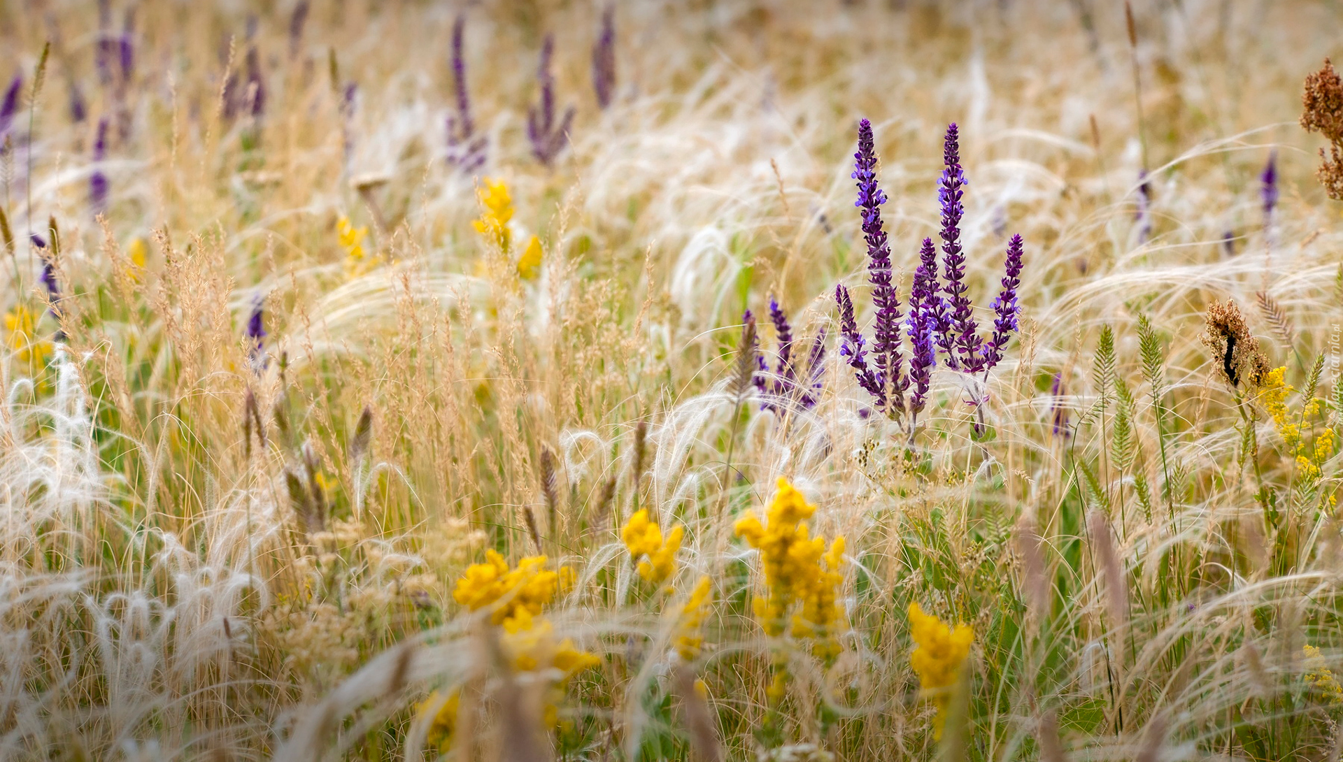 Edytor tapety: Lawenda i żółte kwiaty w pożółkłej trawie