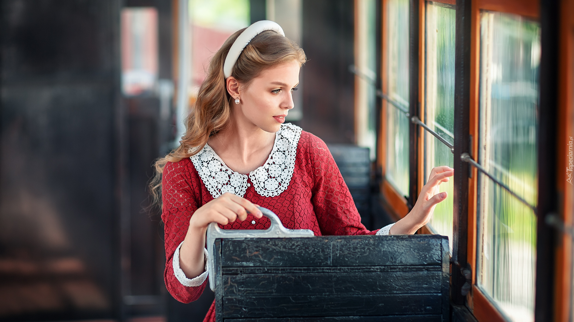 Edytor tapety: Blondynka w czerwonej sukience przy oknie