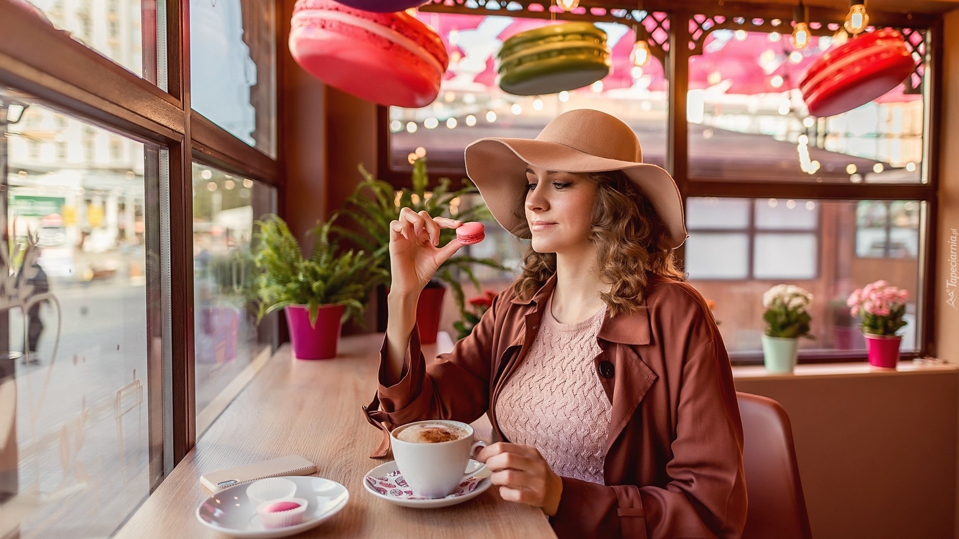 Edytor tapety: Kobieta w kapeluszu przy kawiarnianym stoliku