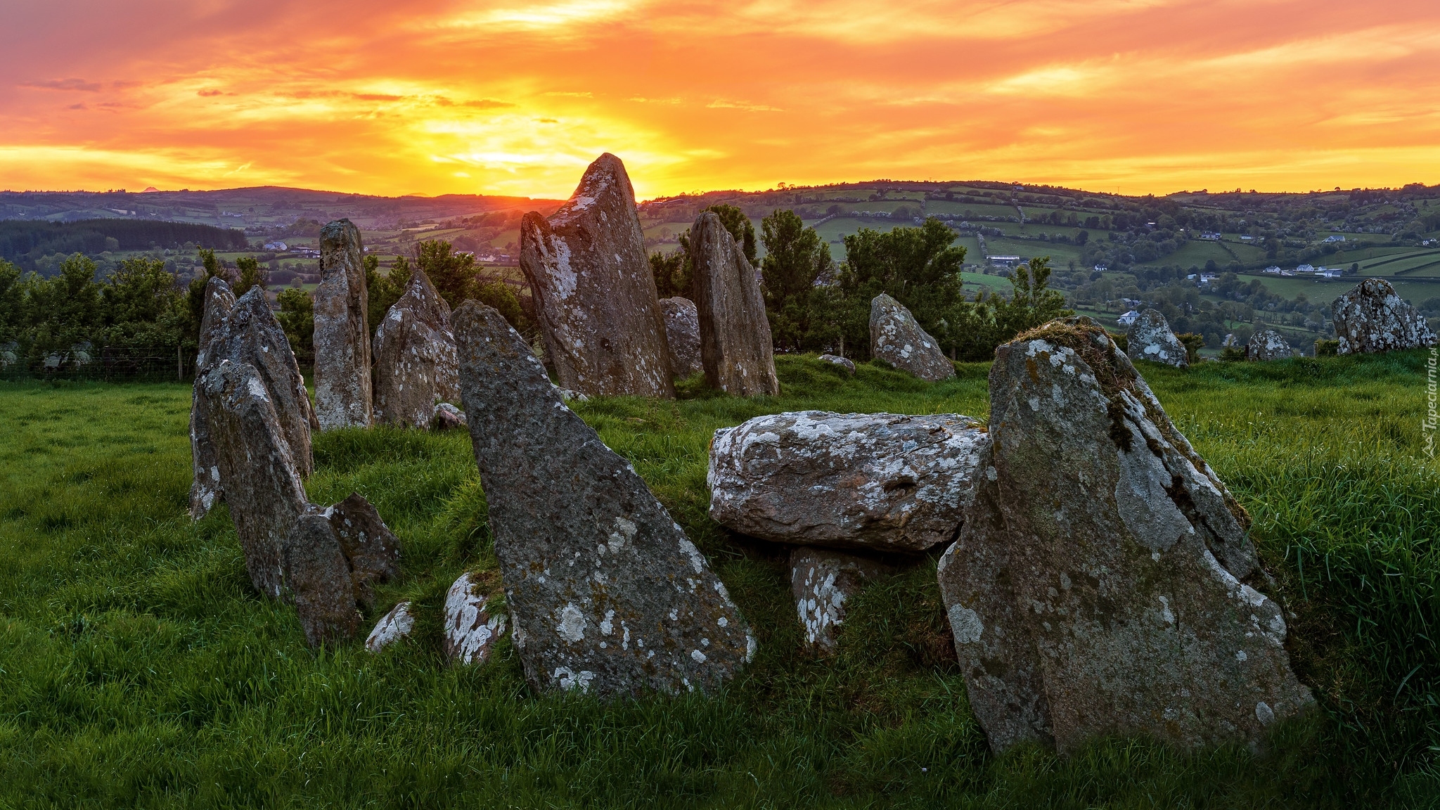 Edytor tapety: Kamienny krąg Beltany Stone Circle o zachodzie słońca