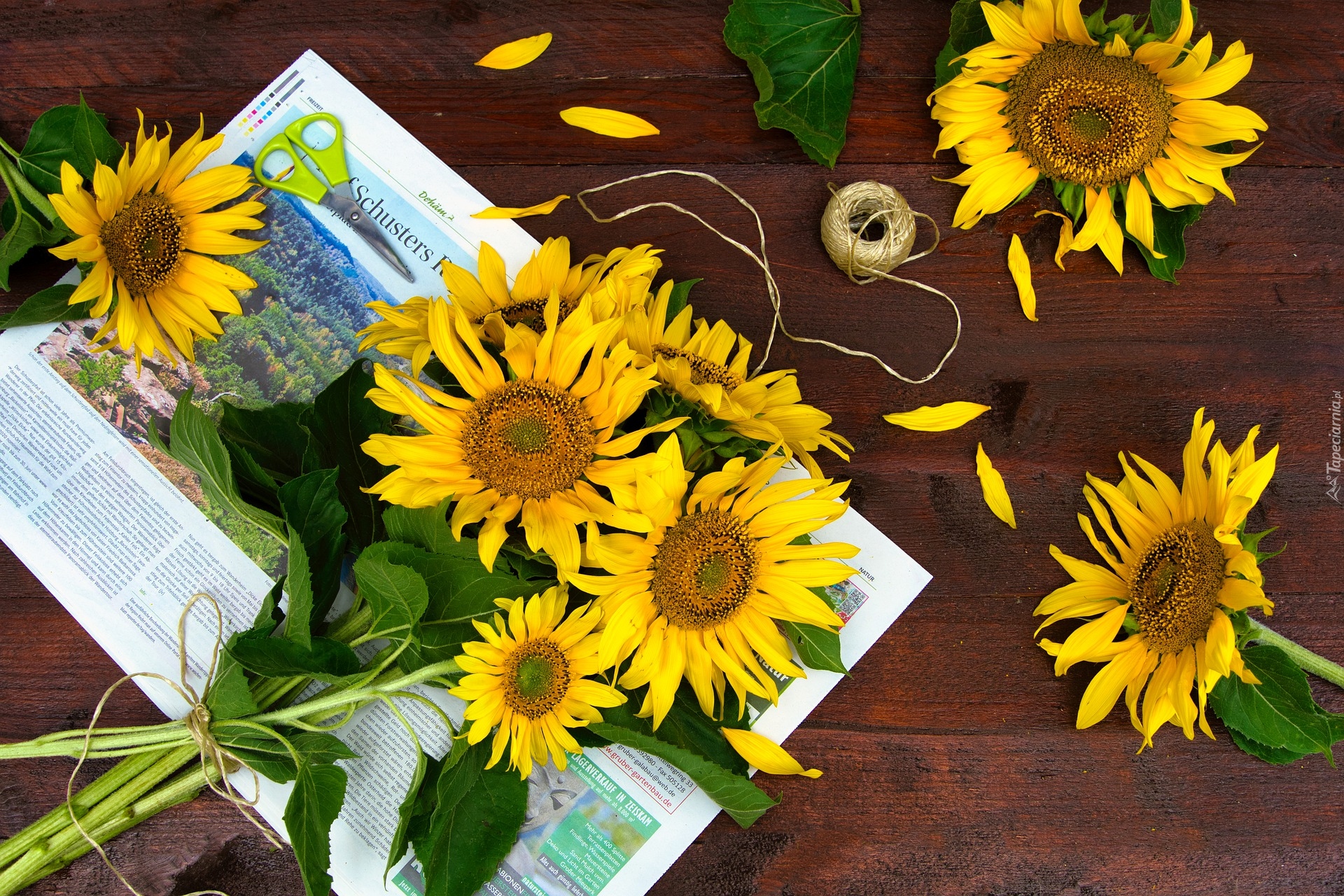 Edytor tapety: Słoneczniki na gazecie i deskach
