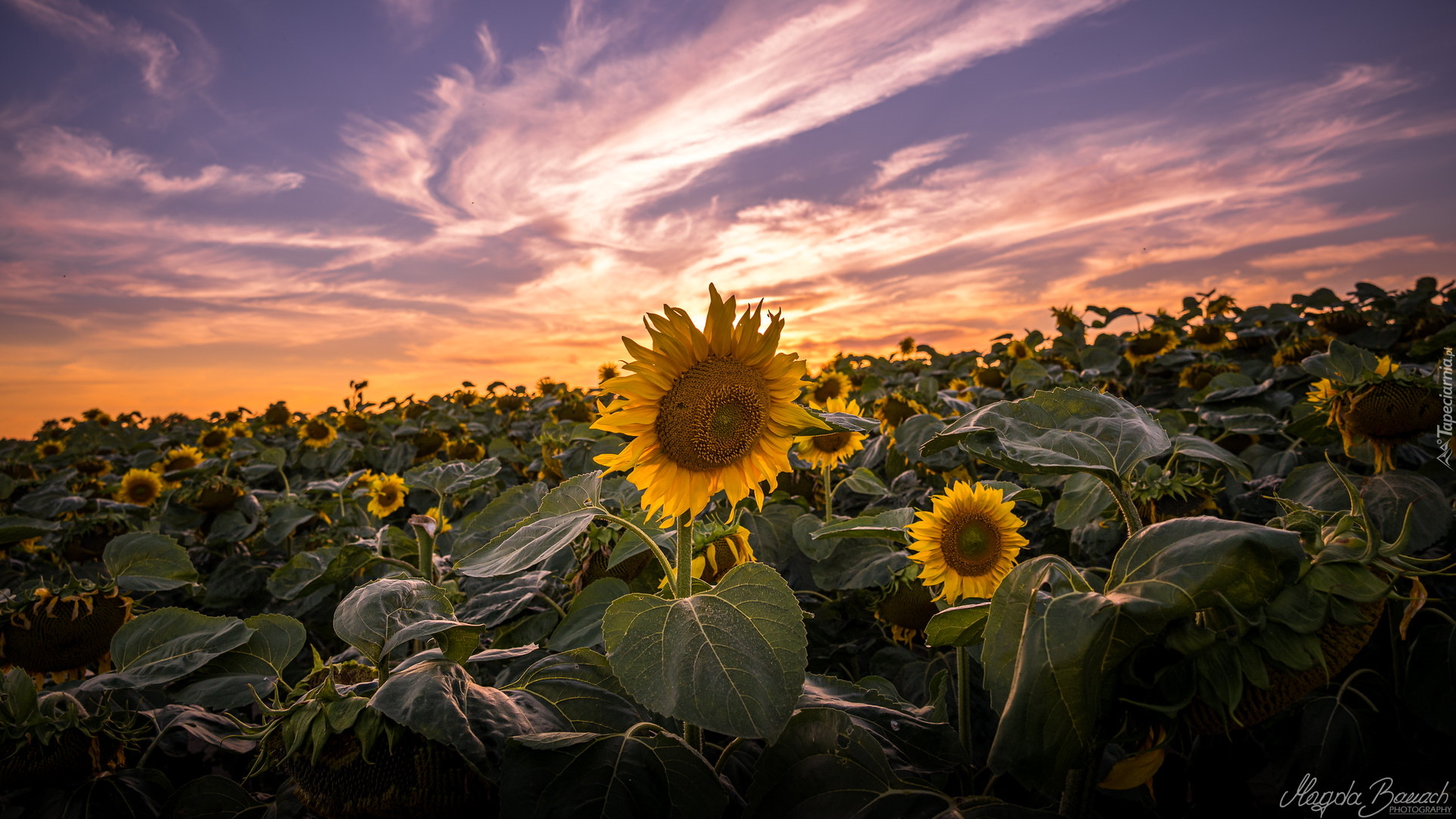 Edytor tapety: Pole słoneczników pod kolorowymi chmurami