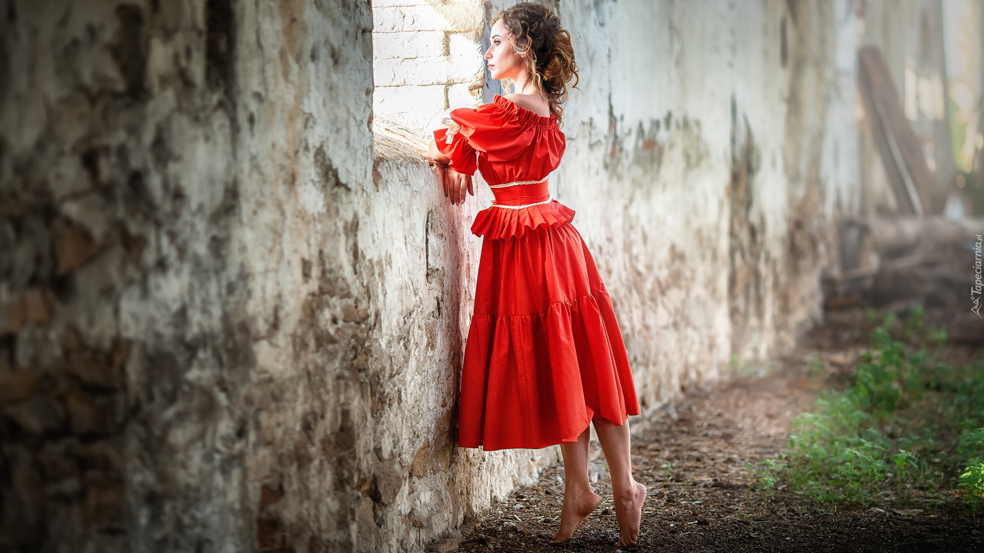 Edytor tapety: Kobieta w czerwonej sukience przy oknie