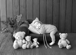 Edytor tapety: Pluszowe misie obok śpiącego niemowlaka na sofie