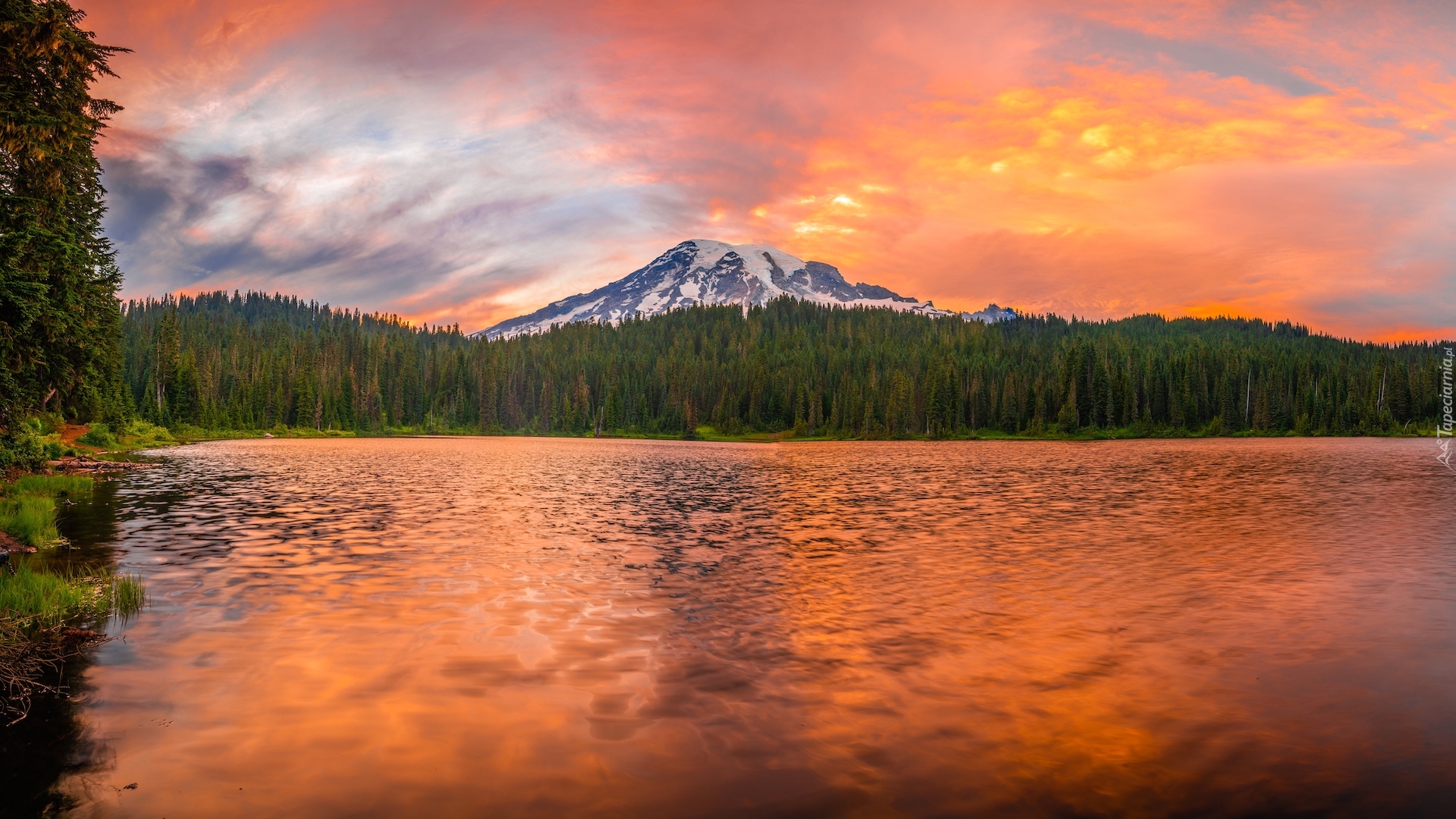 Edytor tapety: Stratowulkan Mount Rainier i las nad jeziorem