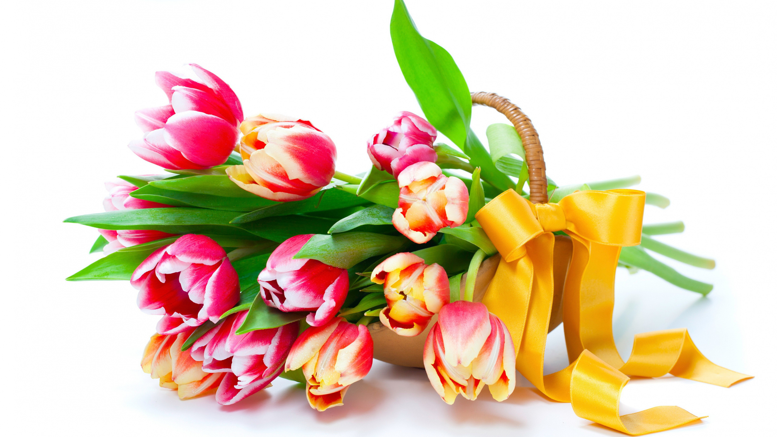 Edytor tapety: Kolorowe tulipany w koszyku z żółtą kokardą