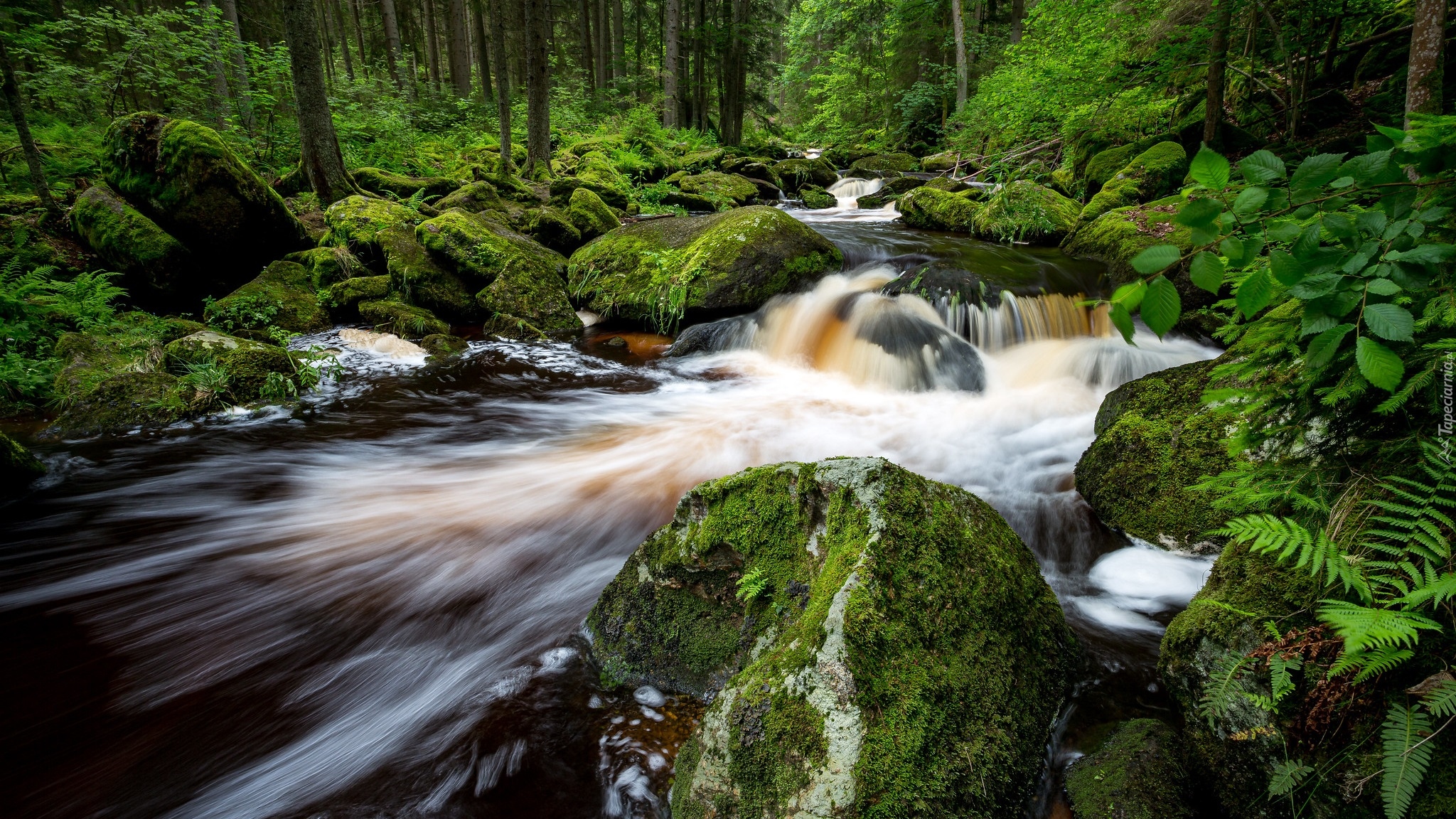 Edytor tapety: Omszałe głazy i rośliny przy rwącej leśnej rzece