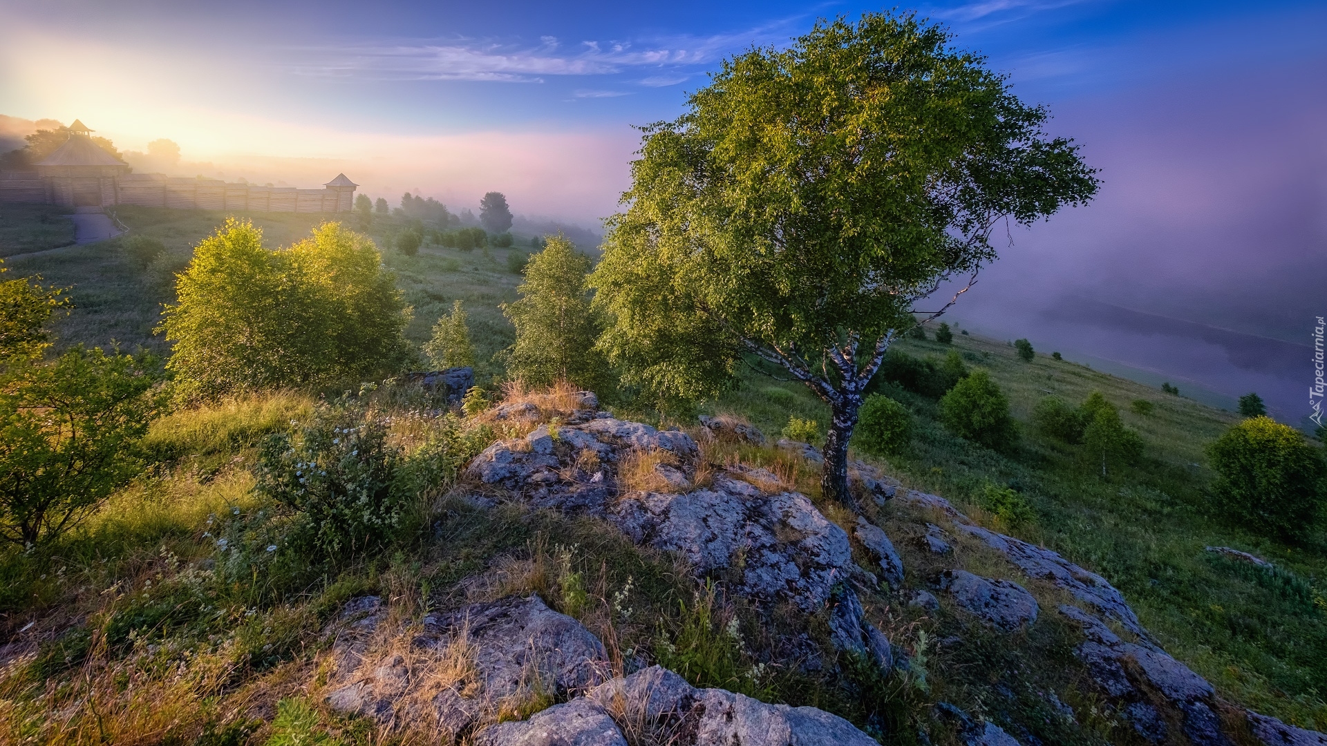 Edytor tapety: Brzoza na skałach o wschodzie słońca