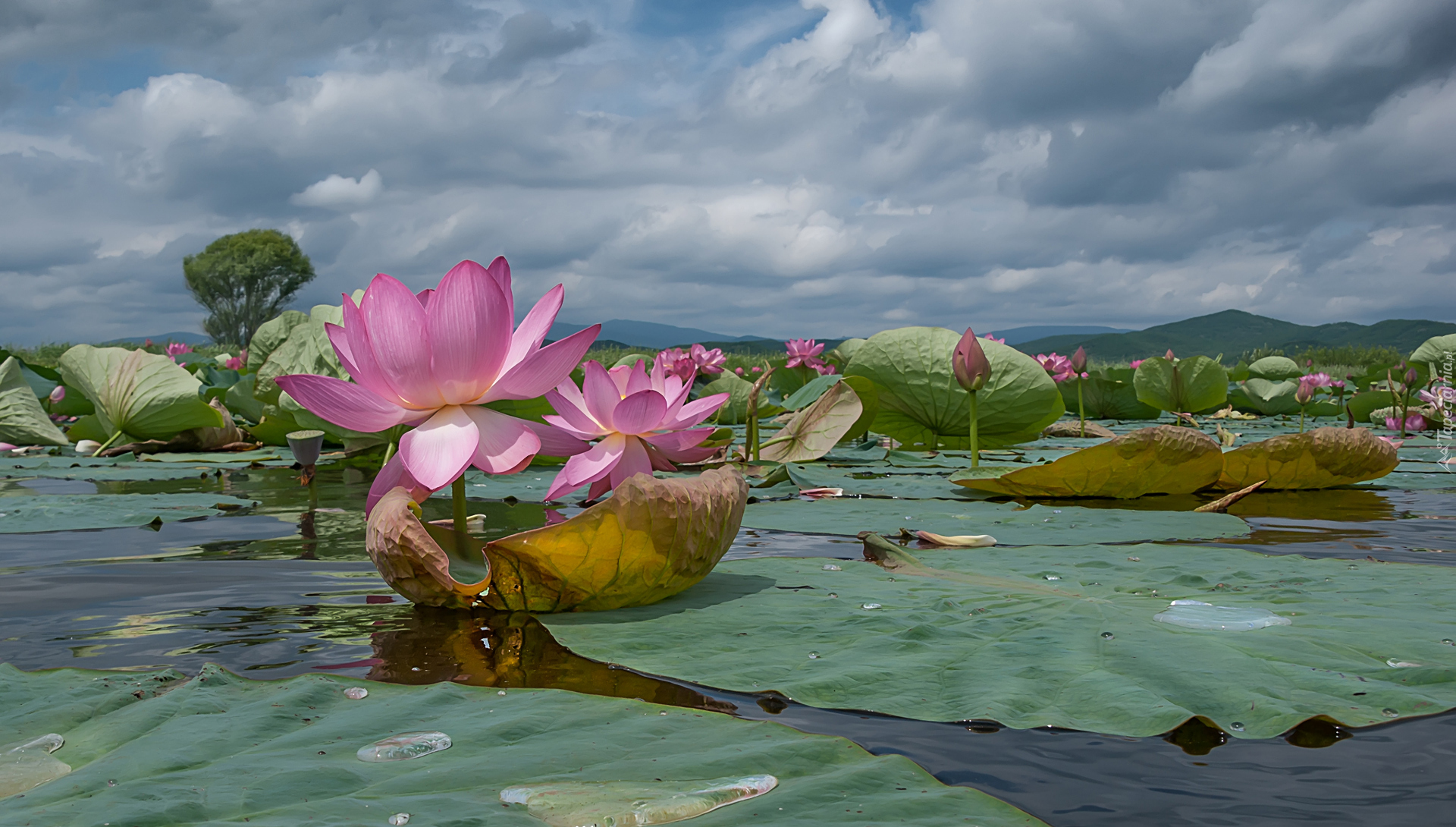 Edytor tapety: Różowe kwiaty lotosu i liście na wodzie