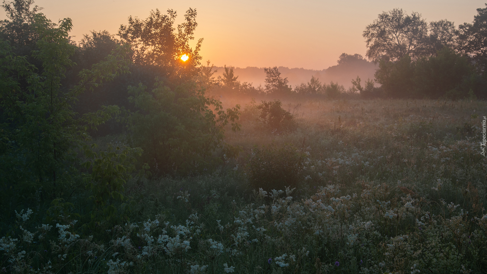 Edytor tapety: Poranna mgła unosząca się nad drzewami na łące