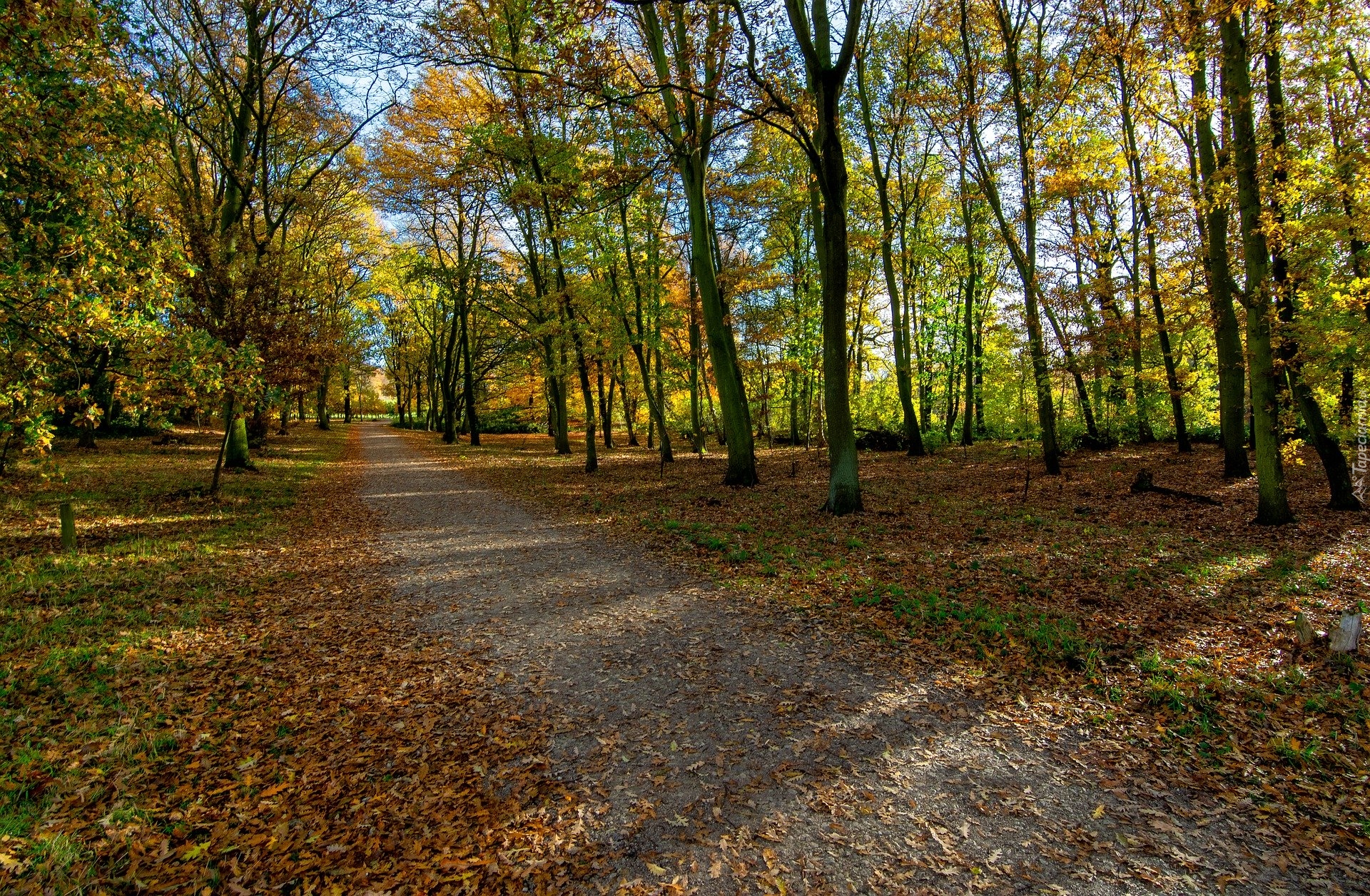 Edytor tapety: Ścieżka pośród opadłych liści wśród drzew