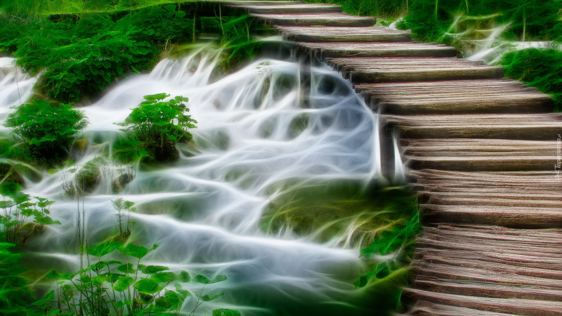 Edytor tapety: Drewniany pomost nad rwącą rzeką