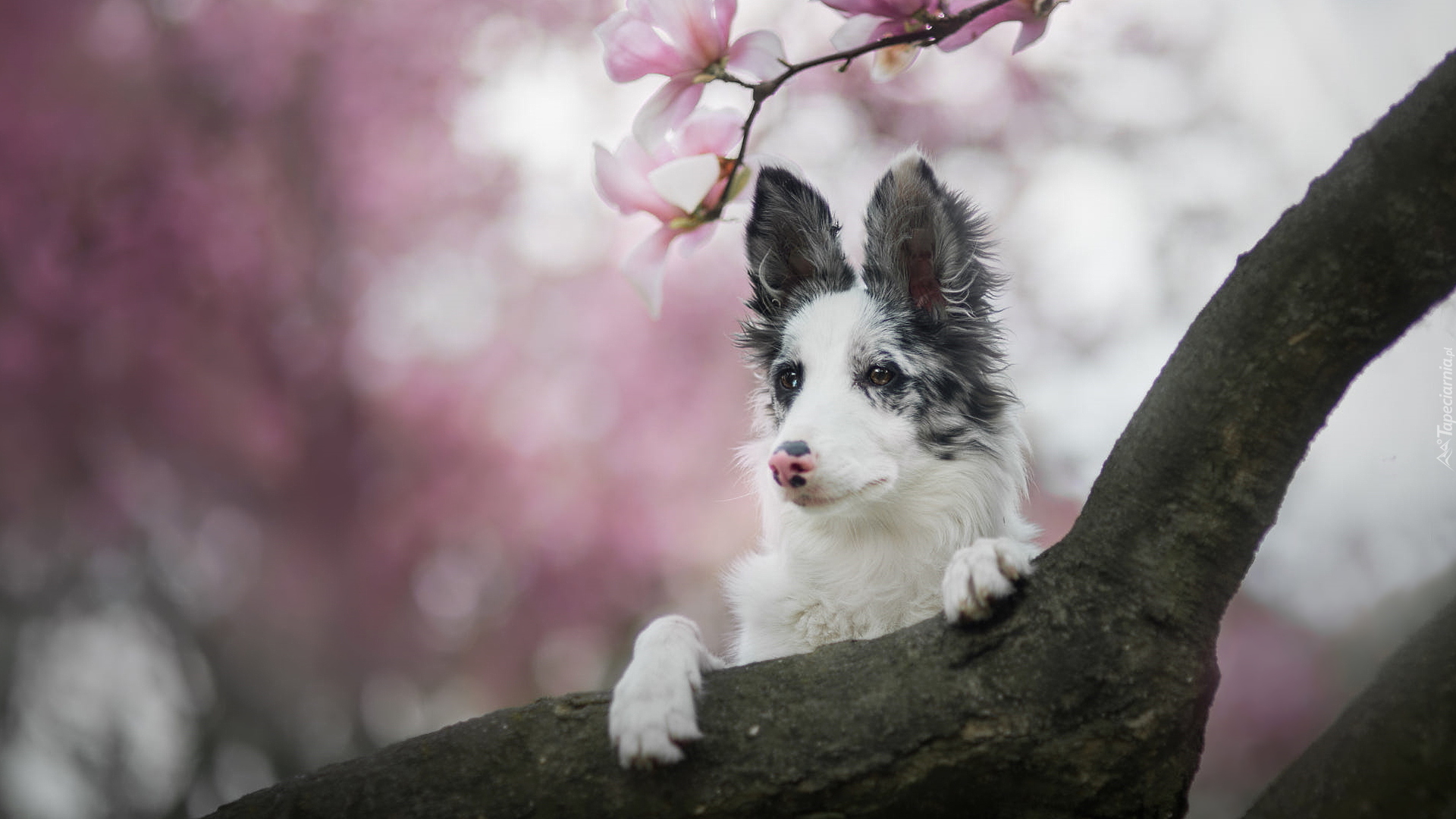 Edytor tapety: Border collie pod gałązką magnolii