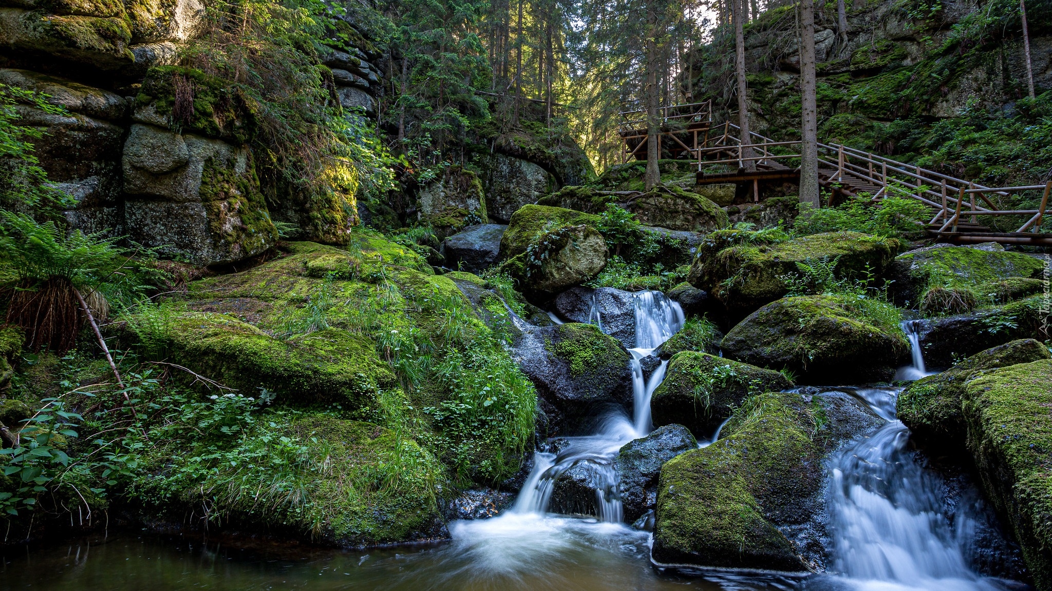 Edytor tapety: Drewniane schody nad leśnym strumieniem na omszałych głazach