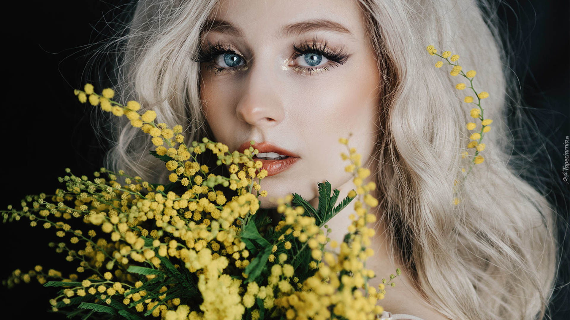 Edytor tapety: Blondynka z gałązkami akacji srebrzystej
