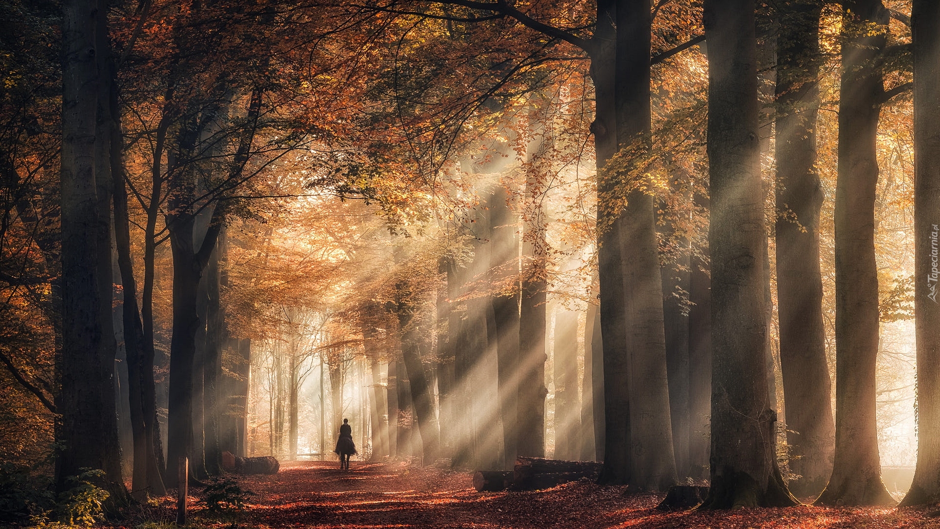 Edytor tapety: Jeździec na leśnej drodze rozświetlonej słońcem