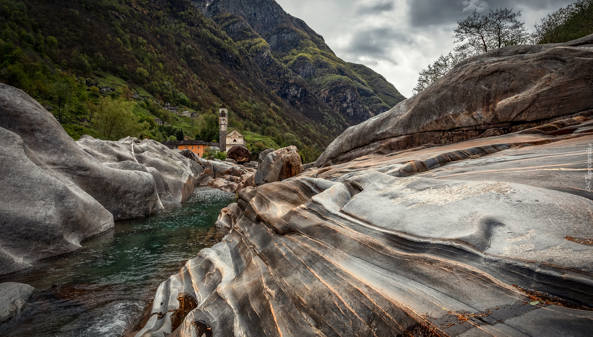 Edytor tapety: Widok ze skał na kościół w Dolinie Verzasca