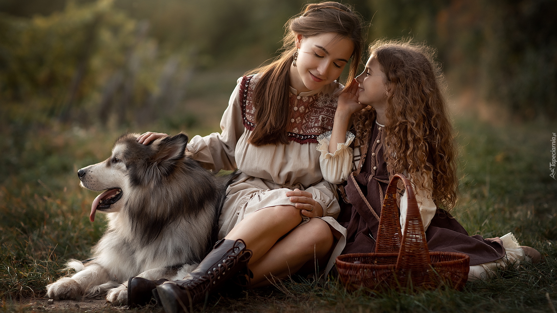Edytor tapety: Dziewczynka i kobieta siedzące na trawie z psem