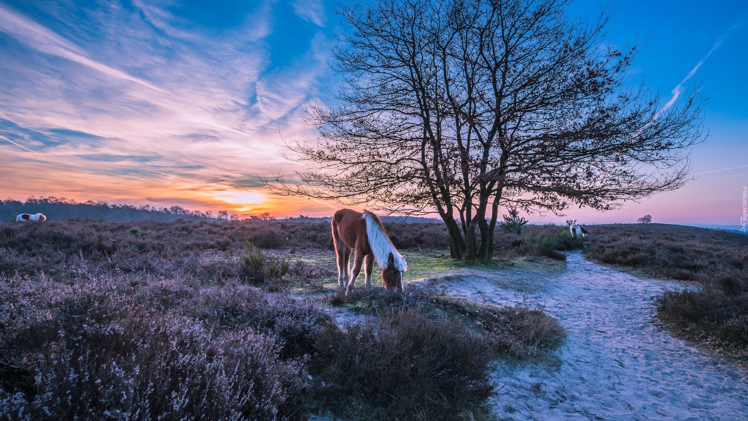 Edytor tapety: Koń obok drzewa na wrzosowisku