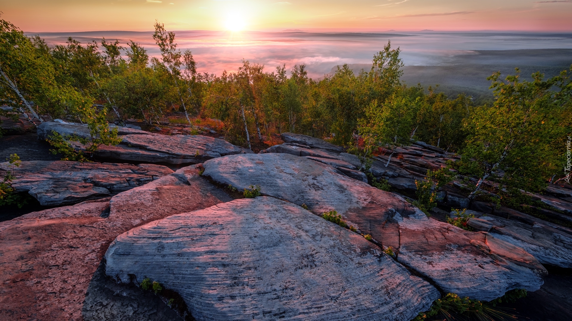 Edytor tapety: Brzozy na skałach góry Krestovaya w Rosji