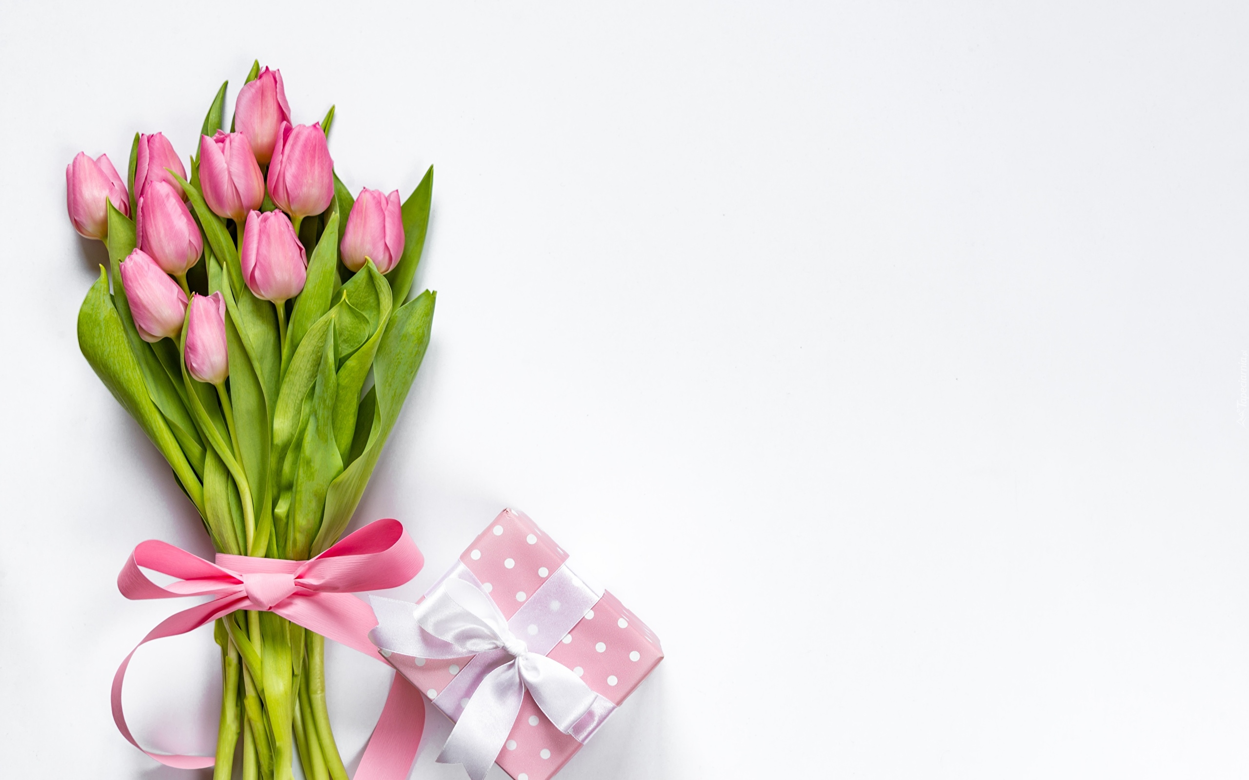 Edytor tapety: Prezent obok wiązanki tulipanów