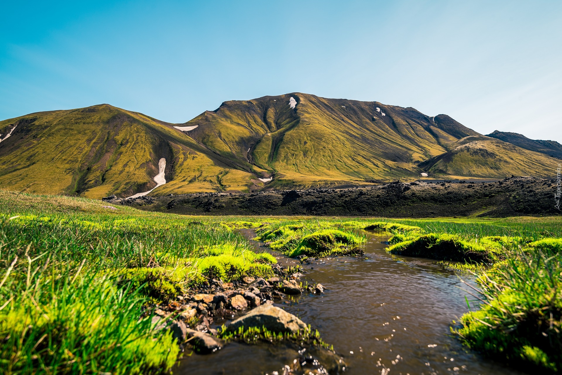 Edytor tapety: Zielone trawy nad rzeką w Islandii