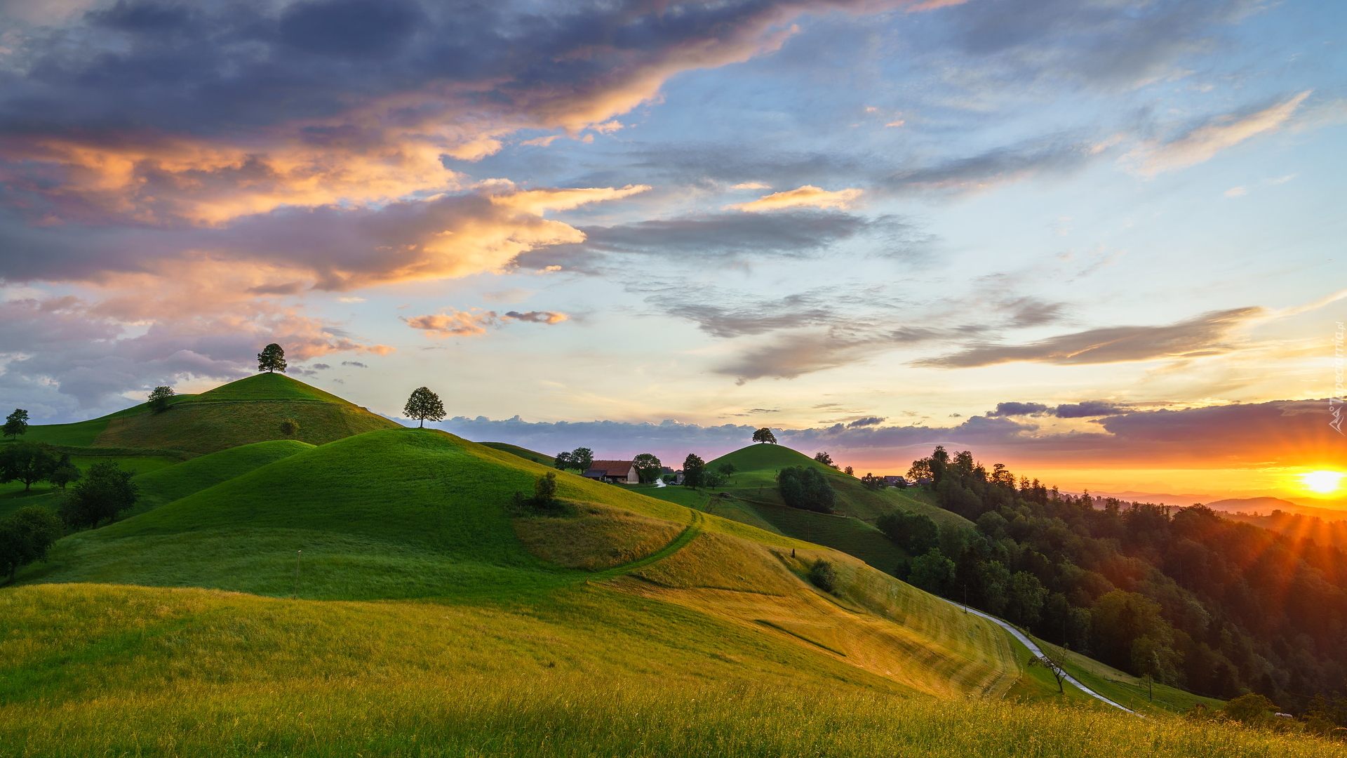 Edytor tapety: Drzewa na zielonych wzgórzach w Menzingen
