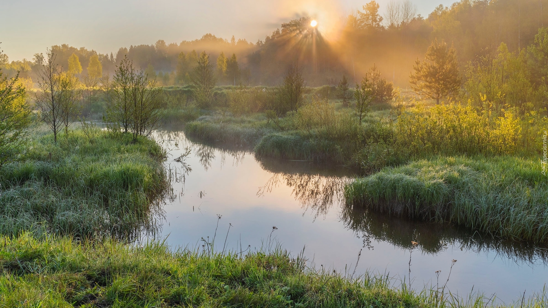 Edytor tapety: Trawa i drzewa nad zamgloną o poranku rzeką
