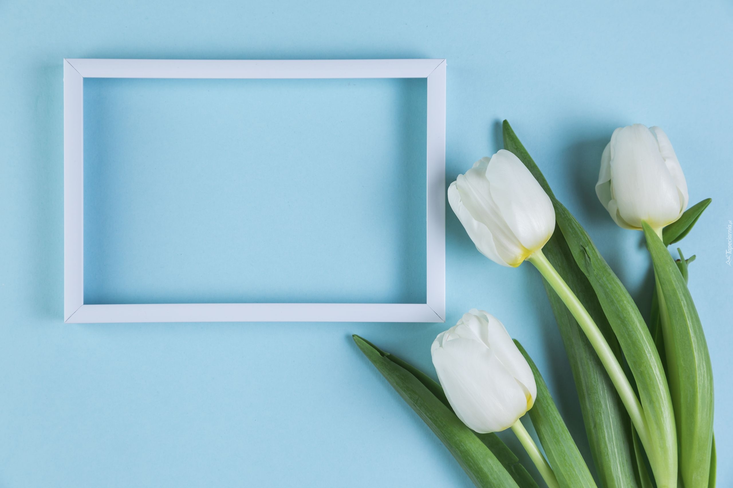 Edytor tapety: Białe tulipany i ramka na niebieskim tle