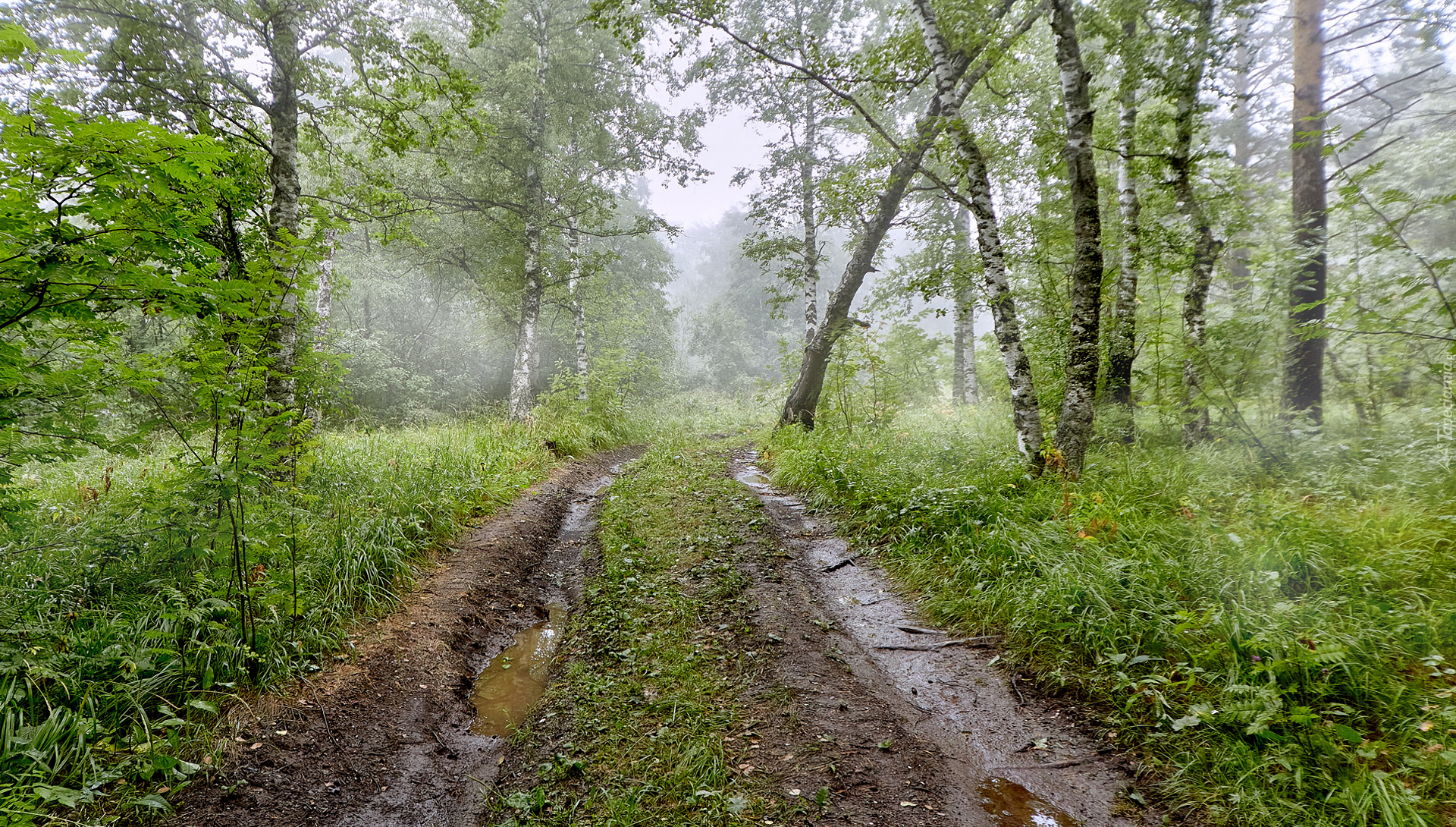 Edytor tapety: Błotnista droga w zamglonym lesie