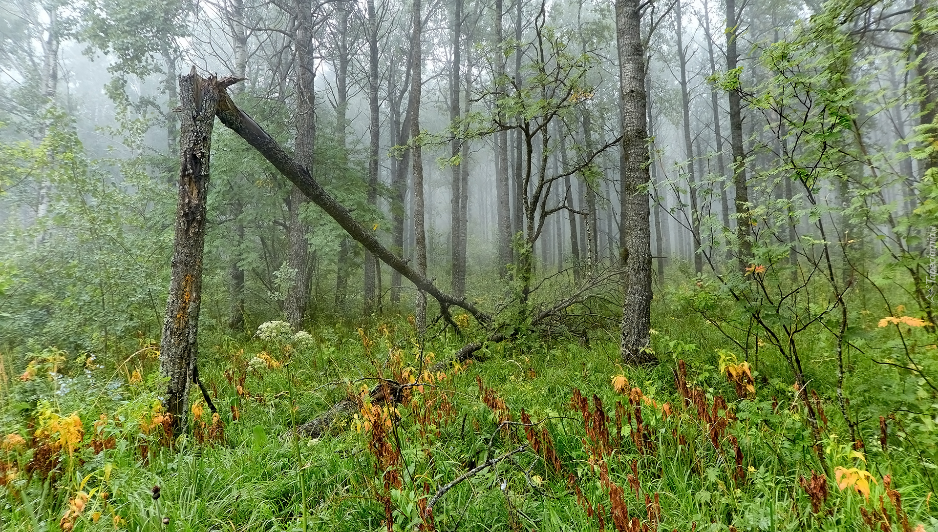 Edytor tapety: Złamane drzewo w zamglonym lesie