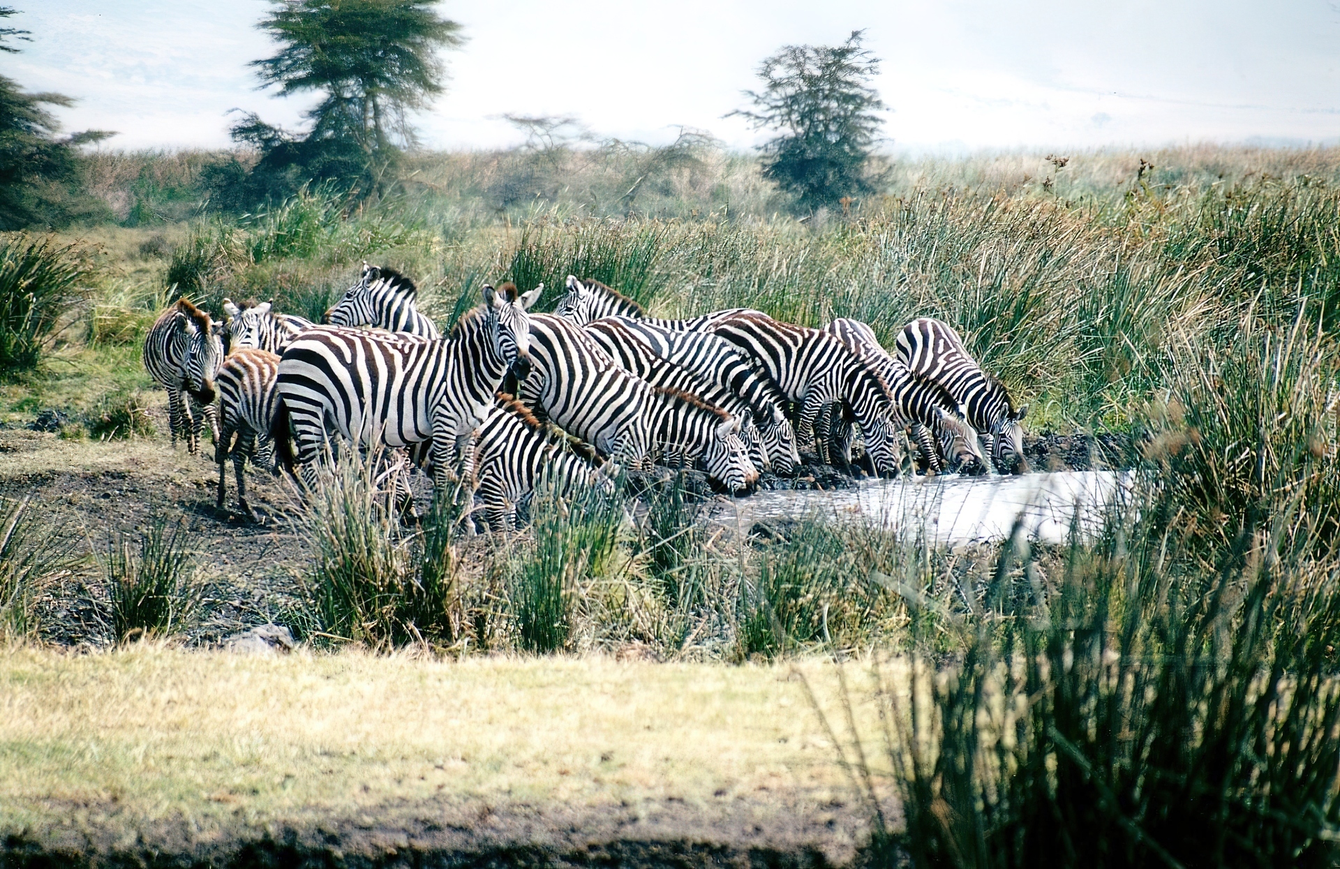 Edytor tapety: zebry, trawa, drzewa, wodopój, rzeka