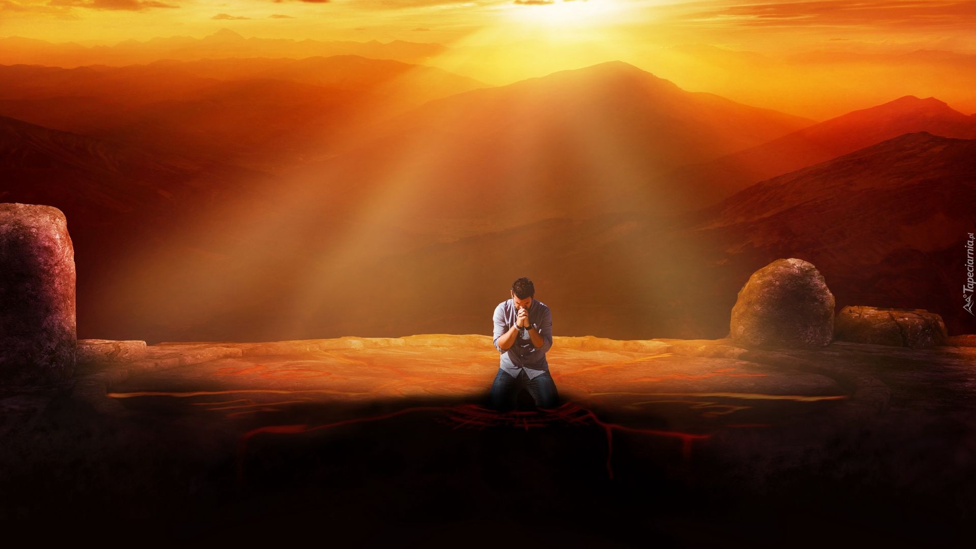 Edytor tapety: Klęczący mężczyzna na tle zachodzącego nad górami słońca