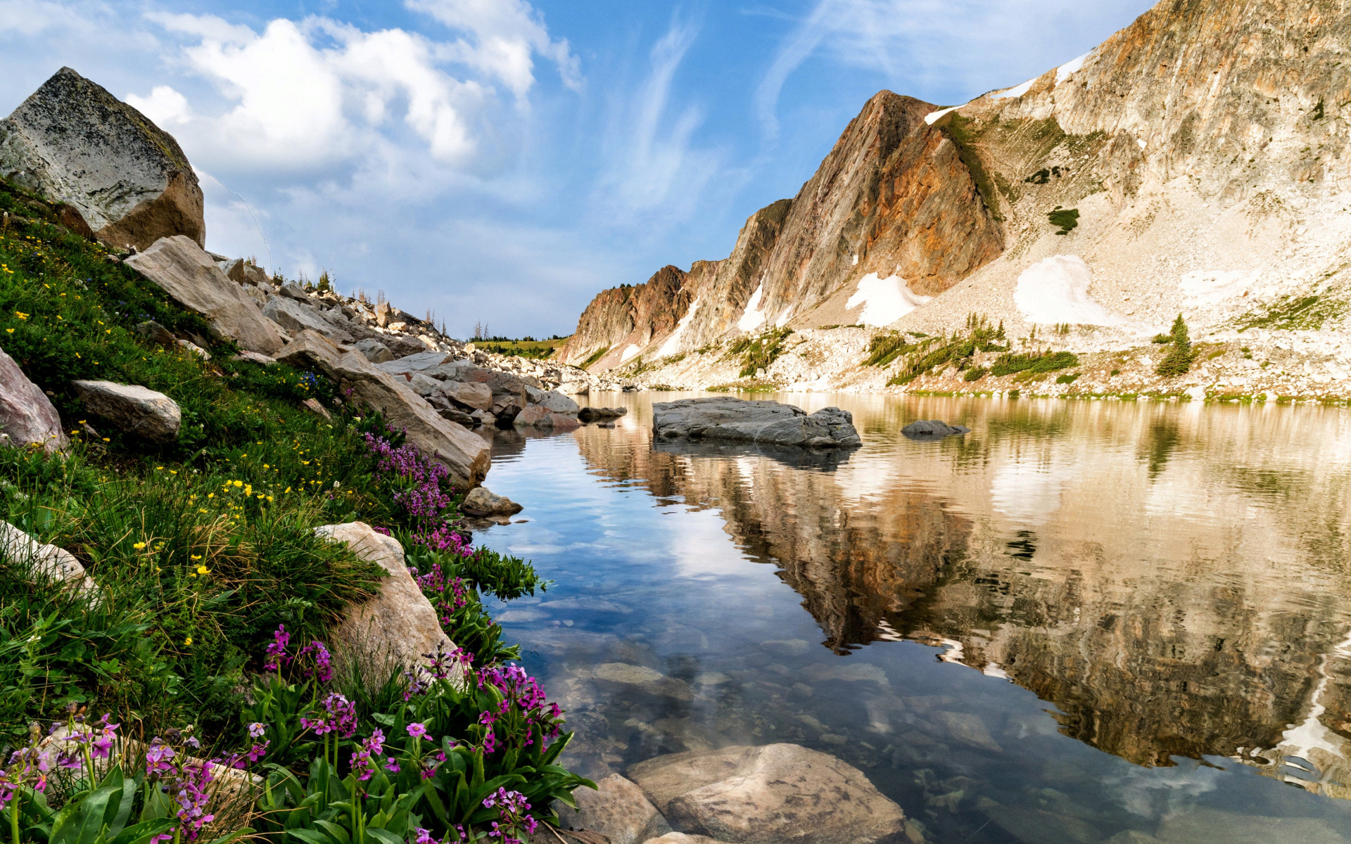 Edytor tapety: Skały i kwiaty na brzegu górskiego jeziora