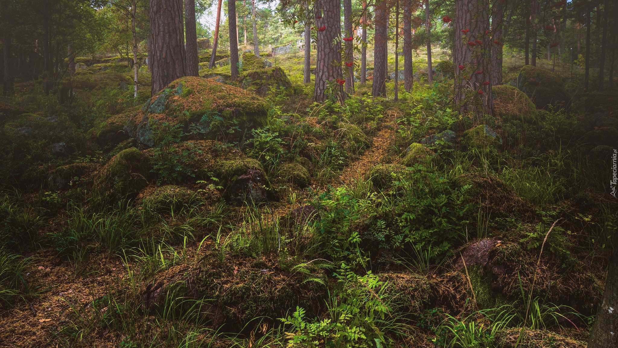 Edytor tapety: Ścieżka pomiędzy omszałymi kamieniami w lesie