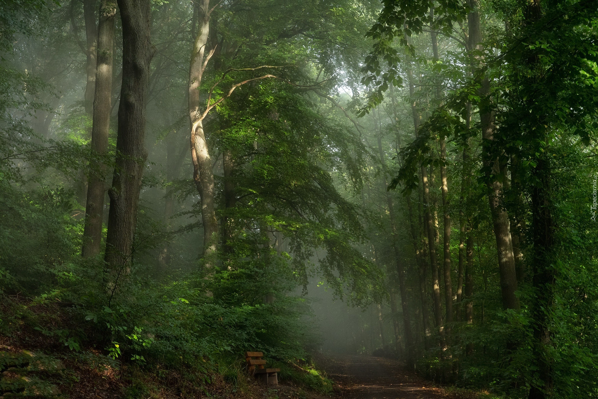 Edytor tapety: Ławka przy drodze w zamglonym lesie